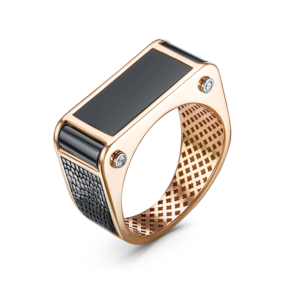 Печатка мужская из красного золота с ониксом и фианитами 034908